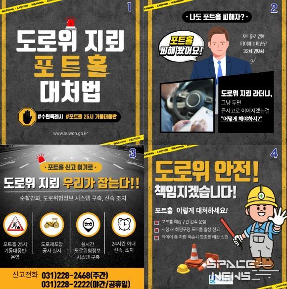 수원시는 최근 포트홀 대처법, 수원시의 포트홀 대응 정책 등을 안내하는 카드뉴스 ‘도로 위 지뢰 포트홀 대처법’을 제작해 시민들에게 대처 방법을 적극적으로 홍보하고 있다.