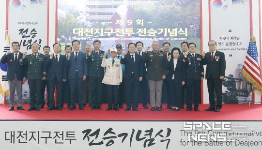 스페이스뉴스 스페이스뉴스 기자 | 대전시는 11일 시청에서 제9회 대전지구전투 전승기념식을 개최했다. 대전지구전투는 6·25전쟁 당시 미 24사단이 참여해 낙동강 방어선 구축에 결정적 기여를 한 방어 전투로 이날 기념식에는 이장우 대전시장과 미8군 사령관을 비롯해 6·25참전 유공자회 등 보훈단체 회원 350여 명이 참석했다.
