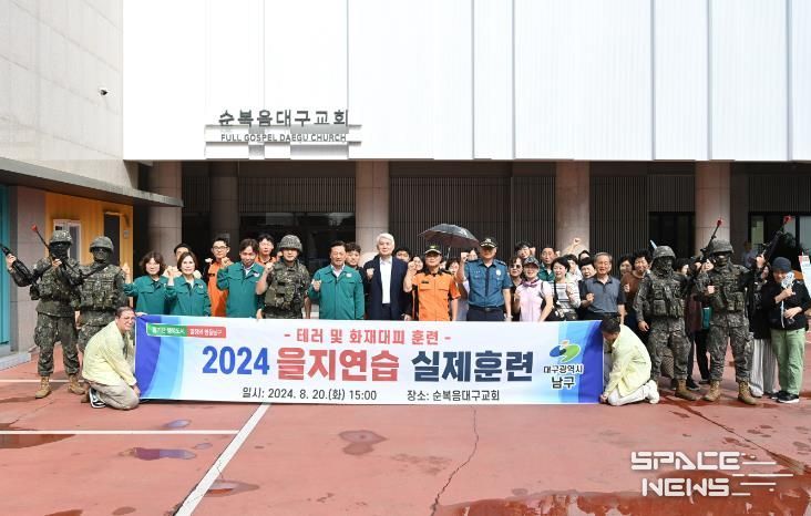 스페이스뉴스 스페이스뉴스 기자 | 대구 남구는 20일 오후 3시, 순복음대구교회에서 다중이용시설에 대한 테러범의 폭발물 폭파에 의한 화재발생, 테러범 및 화재진압, 주민대피 등 테러 및 화재 대응 훈련을 주제로 한 『2024년 을지연습 실제훈련』을 실시했다.