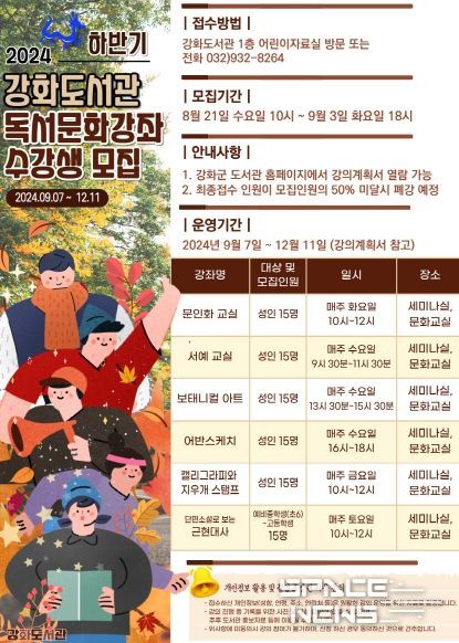 현재 프로그램 및 도서관별 수강생을 모집하고 있으며, 자세한 사항은 강화군 도서관 홈페이지 및 각 도서관에 방문 및 전화를 통해 확인할 수 있다.