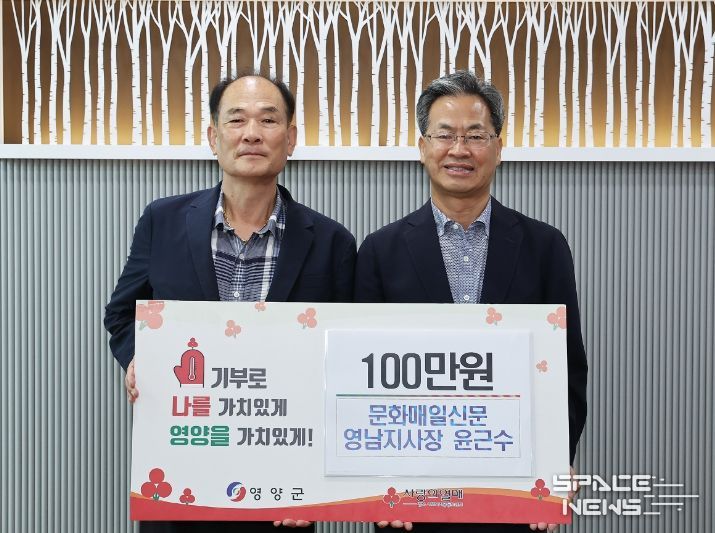 스페이스뉴스 스페이스뉴스 기자 | 문화매일신문 영남지사 윤근수 지사장은 23일 영양군을 방문해 지역의 어려운 이웃 위한 성금 100만 원을 기부했다.
