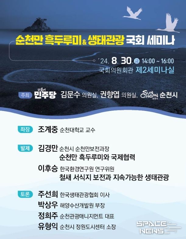스페이스뉴스 스페이스뉴스 기자 | 순천시는 김문수 의원실과 권향엽 의원실 공동 주최로 오는 30일 오후 2시에 국회의원회관 제2세미나실에서 ‘순천만 흑두루미 · 생태관광’ 국회 세미나를 개최한다고 밝혔다.