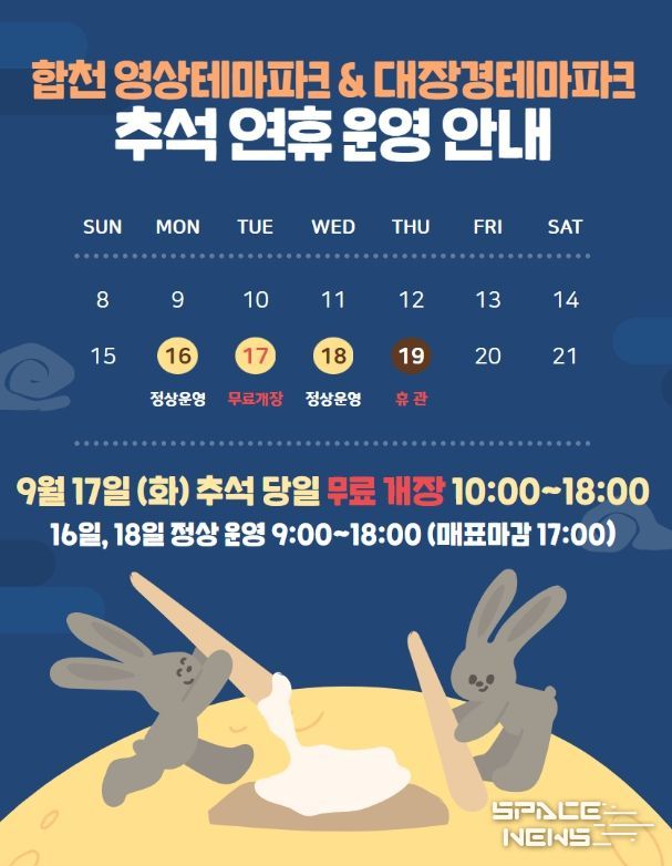 스페이스뉴스 스페이스뉴스 기자 | 합천군은 이번 추석 연휴 동안 가족들과 함께 특별한 시간을 보내고자 하는 분들을 위해 합천영상테마파크와 대장경테마파크를 정상 운영한다고 4일 밝혔다.