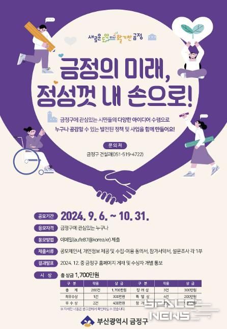 아이디어 공모전은 금정구에 관심 있는 누구나 참여 가능하며, 주제는 ‘금정의 미래, 정성껏 내손으로!’이다. 세부 분야는 △문화·예술 공간 창출을 통한 생활 인구 확대 및 삶의 질 향상 방안 △역사·관광 자원을 활용한 지역경제·상권 활성화 방안 △힐링·녹색 공간 조성을 통한 인구 유출 방지 및 정주 여건 개선 방안이다.