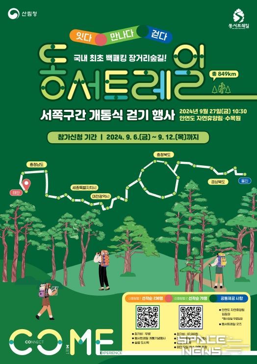 스페이스뉴스 스페이스뉴스 기자 | 산림청은 오는 9월 27일 충청남도 태안군에서 개최되는 ‘동서트레일 서쪽구간 숲길 걷기행사’ 참가자를 모집한다고 6일 밝혔다.