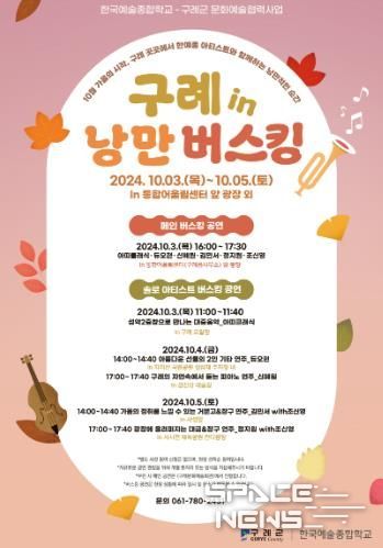 K-ART를 선도하고 있는 ‘한국예술종합학교’ 아티스트들이 국립공원 제1호 지리산국립공원과 청정하천 섬진강 등 자연이 만들어 낸 최고의 무대에서 10월 3일부터 10월 5일까지 ‘구례 in 낭만 버스킹’이라는 주제로 공연을 펼친다.
