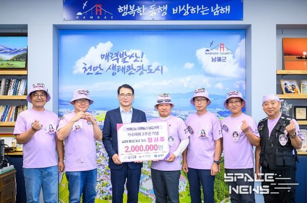 스페이스뉴스 스페이스뉴스 기자 | 남해군 홍보대사 가수 정서주의 공식 팬클럽 ’동분서주‘ 회원들이 지난 27일 남해군청을 방문해 이웃돕기 성금 200만 원을 기탁했다.