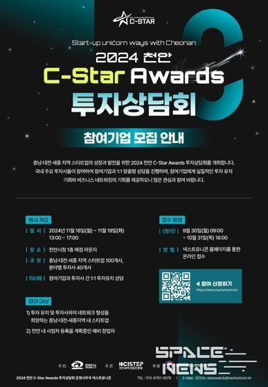 스페이스뉴스 스페이스뉴스 기자 | 천안시는 10월 31일까지 ‘2024 천안 C-STAR Awards’ 투자상담회에 참여할 스타트업을 모집한다고 30일 밝혔다.