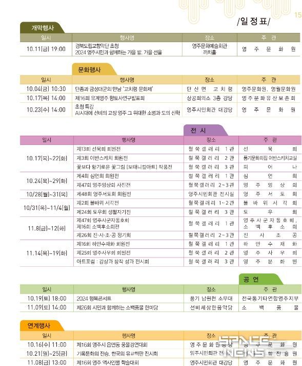 또, 17일 오후 2시 ‘제16회 유계영주향토사 연구발표회’와 19일 오후 6시 풍기 남원천 소무대에서 ‘2024 통기타 행복 콘서트’, 23일 오후 2시에는 인문학 초청특강이 시민회관 강당에서 진행될 예정이다.