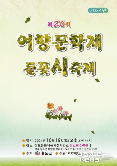 스페이스뉴스 스페이스뉴스 기자 | 청도군이 주최하고 여향예원(대표 이기철)이 주관하는 “제20회 들꽃시축제”가 19일 청도군 청소년 수련관 다목적홀에서 개최된다.