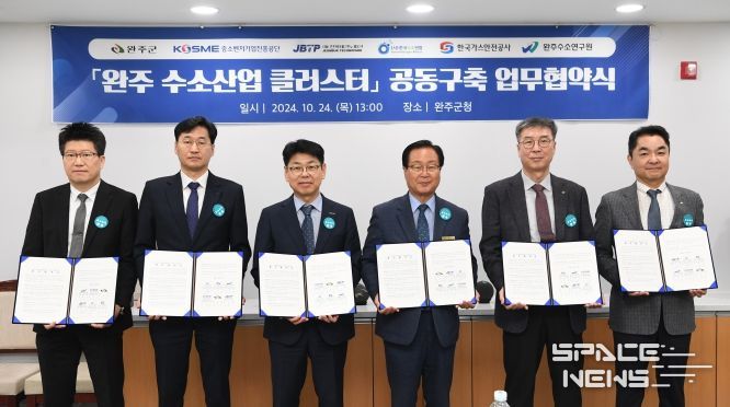 스페이스뉴스 스페이스뉴스 기자 | 수소 산업을 선도하고 있는 완주군이 수소 기업 지원책 마련을 위해 중소벤처기업진흥공단, 한국수소연합, 한국가스안전공사, 전북테크노파크, 완주수소연구원과 ‘완주 수소산업 클러스터’ 공동 구축을 위한 업무협약을 체결했다.