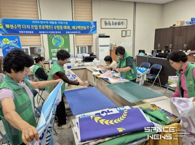 스페이스뉴스 스페이스뉴스 기자 | 장흥군새마을부녀회(회장 전순란)는 폐현수막을 활용해 수방용 마대, 돗자리 겸용 마대, 에코백, 화분 등 700여점을 제작하는 ‘폐현수막 다시 쓰임 프로젝트’를 실시했다.