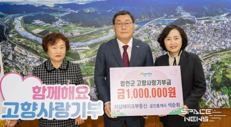 스페이스뉴스 스페이스뉴스 기자 | 합천군은 지난 31일, 창원시 소재 더샵레이크부동산 석순희 대표가 고향사랑기부금 100만원을 기탁했다고 밝혔다.