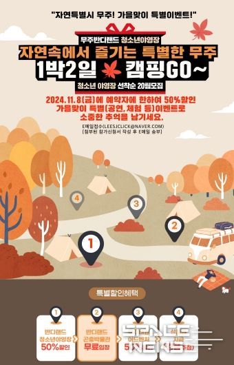 자연 속에서 즐기는 특별한 무주 1박 2일 캠핑 여행’ 참가를 원하는 사람(텐트 및 캠핑장비 지참 필수)은 행사포스터 내 QR코드를 통해 신청서 접수를 하면 된다.(문의 063-227-4450) 참가자들에게는 반디랜드 야영장 할인 및 행운권 추첨 등 다양한 혜택이 주어진다.
