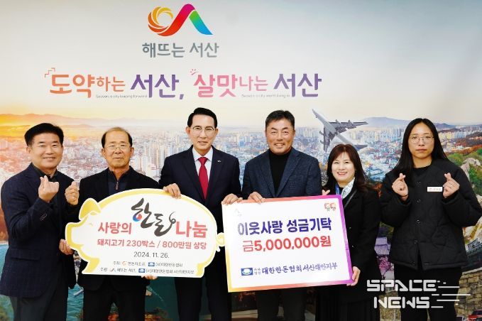 스페이스뉴스 스페이스뉴스 기자 | 서산시는 26일 대한한돈협회 서산태안지부가 한파로 힘든 겨울을 보낼 어려운 이웃을 위해 성금 500만 원과 한돈 230박스를 기탁했다고 밝혔다.