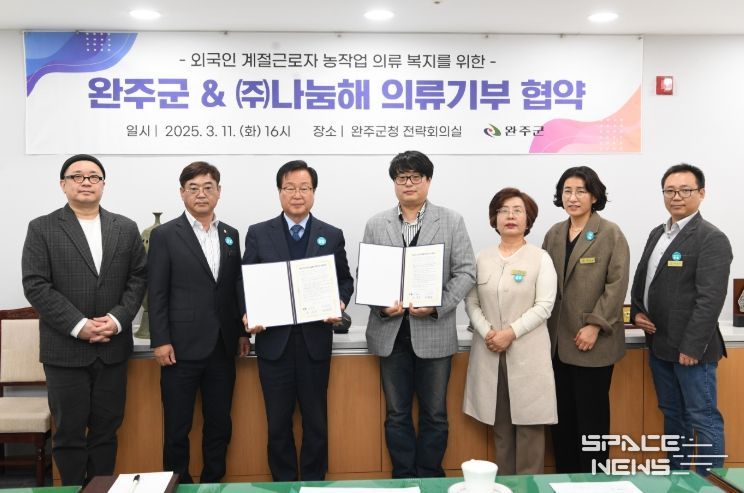 스페이스뉴스 스페이스뉴스 기자 | 완주군이 의류기업 ㈜나눔해(대표 박형규)와 11일 외국인 계절근로자 복지를 위한 의류기부 업무협약을 체결했다.