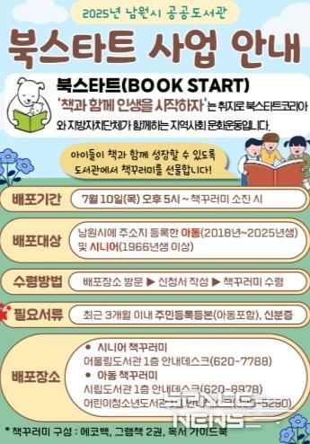 연령단계별로 선정된 그림책 2권과 가이드북, 전용 에코백으로 구성된 ‘북스타트 책꾸러미’는 남원시에 주소지를 둔 2018~2025년생 아동 및 1966년생 이상 시니어를 대상으로 선착순 배포된다.