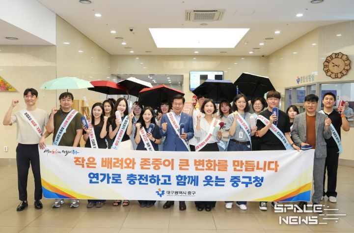 스페이스뉴스 스페이스뉴스 기자 | 대구 중구는 지난 3일 구청 로비에서 혁신사업 발굴단 ‘조직혁신팀’과 함께 ‘일하는 방식 및 조직문화 개선 캠페인’을 개최했다.