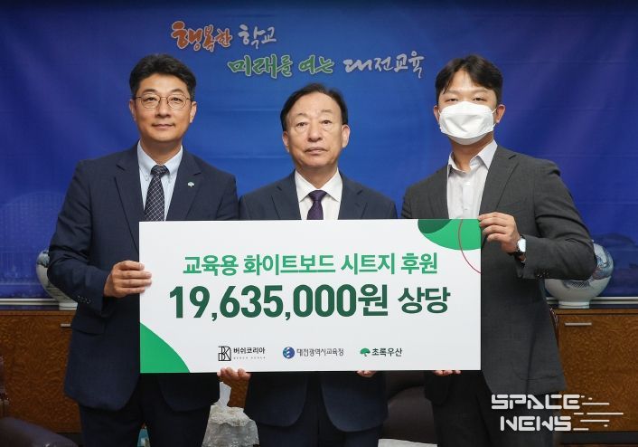 스페이스뉴스 스페이스뉴스 기자 | 대전시교육청은 9월 18일 버쉬코리아의 후원참여 및 초록우산 대전지역본부의 연계로 19,635,000원 상당의 늘봄학교 사용 교육 물품(붙이는 화이트보드 1,050개)을 기탁받았다고 밝혔다.