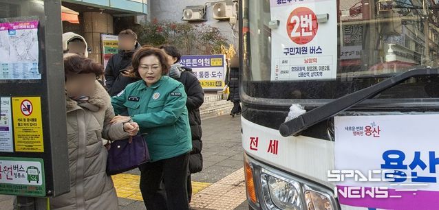 스페이스뉴스 스페이스뉴스 기자 | 박희영 서울 용산구청장이 서울시내버스 파업으로 출퇴근길 교통 혼잡이 우려되는 가운데, 13일 오전 무료 셔틀버스 운행 현장을 직접 찾아 출근길 주민 불편 사항을 점검했다.