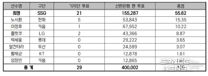 최정은 기자단 투표 총 29표 중 21표(72.4%), 팬 투표 400,002표 중 155,287표(38.8%)로 총점 55.62을 받으며 2019년 6월 이후 4년 만에 월간 MVP에 선정되는 영광을 안았다.