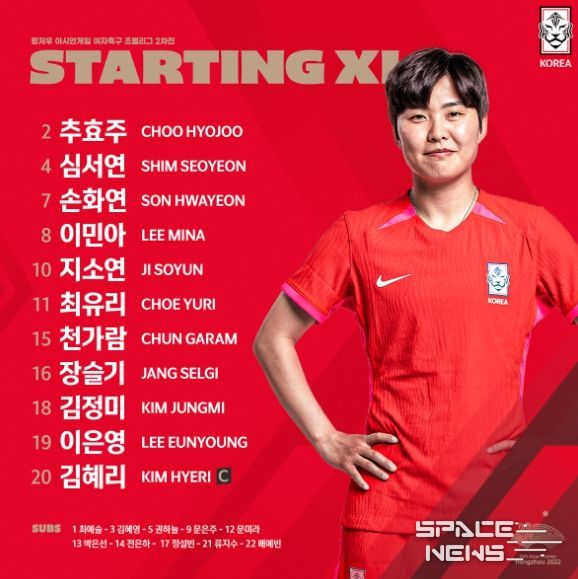포백 수비진은 추효주(수원FC위민) – 심서연(수원FC위민) – 김혜리(인천현대제철) – 이은영(고려대)이 구성하며, 골키퍼 장갑은 김정미(인천현대제철)가 낀다.