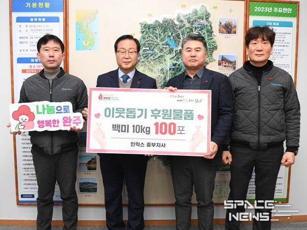 스페이스뉴스 스페이스뉴스 기자 | (주)인익스 중부지사가 완주군에 소외된 이웃에게 전달해 달라며 양곡 10kg 100포(260만 원 상당)를 기탁했다.