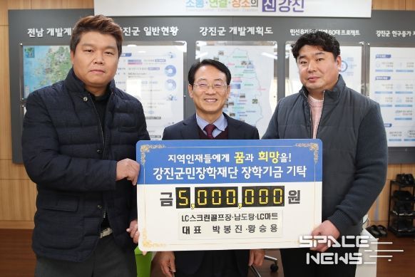 스페이스뉴스 스페이스뉴스 기자 | 강진군 강진읍 LC마트·남도탕·LC스크린골프장 황승용·박봉진 대표가 500만원, LG전자 베스트샵 정종훈 대표가 300만원을 강진군민장학재단에 지난 11일 각각 기탁했다.
