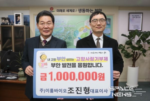 스페이스뉴스 스페이스뉴스 기자 | 부안군은 지난 4일 조진형 ㈜이룸바이오 대표가 부안군 고향사랑기부금 100만원을 기탁했다고 밝혔다.