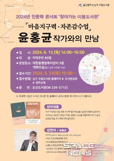 스페이스뉴스 스페이스뉴스 기자 | 울산 남구 도산도서관은 인문학 콘서트 ‘찾아가는 이동도서관’ 윤홍균 작가와의 만남을 6월 13일 대현동행정복지센터에서 운영한다고 밝혔다.