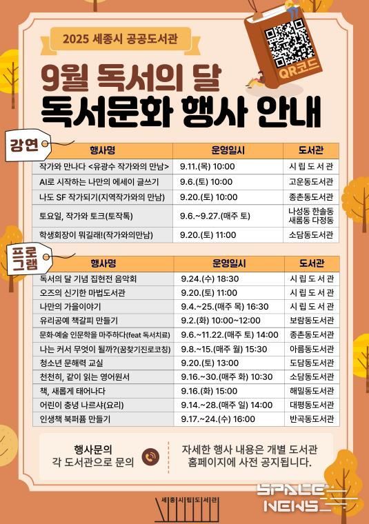 스페이스뉴스 스페이스뉴스 기자 | 세종특별자치시 시립도서관이 9월 독서의 달을 맞아 관내 공공도서관15곳에서 시민 독서 문화 확산을 위한 각양각색의 독서문화 행사를 운영한다.