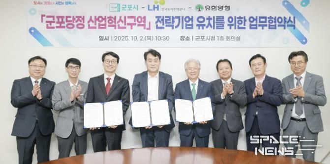 스페이스뉴스 스페이스뉴스 기자 | 군포시는 2일 군포시청에서 한국토지주택공사(LH), ㈜유한양행과 ‘군포당정 산업혁신구역’ R·D 전략기업 유치를 위한 업무협약을 체결했다고 밝혔다.