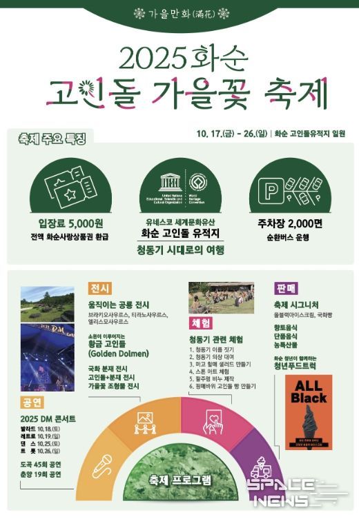 스페이스뉴스 스페이스뉴스 기자 | 전남 화순군)이 오는 10월 17일 ~ 10월 26일까지 10일간 유네스코 세계문화유산인 화순 고인돌 유적지 일대(춘양면 대신리, 도곡면 효산리)에서 '가을만화(滿花)'를 주제로 '2025 화순 고인돌 가을꽃 축제'를 개최한다.