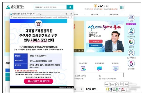 스페이스뉴스 스페이스뉴스 기자 | 울산시는 국가정보자원관리원 대전센터 화재(9.26)로 인해 국민신문고 서비스가 전면 중단됨에 따라, 시민 불편을 최소화하기 위해 울산시 대표 홈페이지 내 온라인 민원창구 ‘울산신문고’를 10월 5일부터 운영한다.