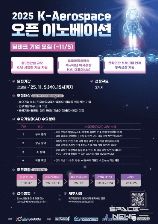 모집 대상은 수요기업인 KAI에서 제시한 4개 분야(우주·항공·AI, 자유)에서 KAI와 협업을 희망하는 기업으로, 서류 및 발표평가를 거쳐 최종 3개사를 선정할 예정이다.