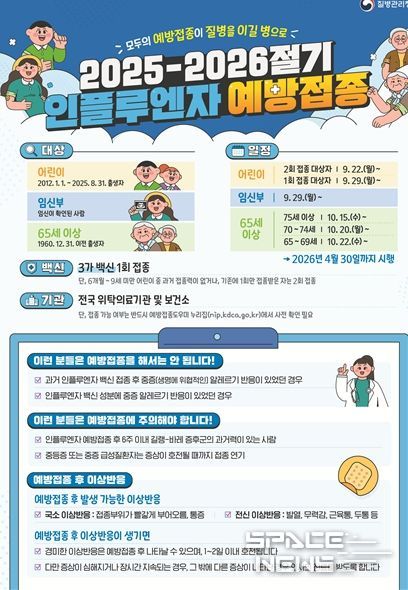 스페이스뉴스 스페이스뉴스 기자 | 질병관리청은 10월 15일부터 65세 이상 어르신을 대상으로 ’25-’26절기 인플루엔자 예, 방접종을 실시하고, 코로나19 고위험군(65세 이상, 면역저하자 등)을 대상으로 ’25-’26절기 코로나19 예방접종을 실시한다.