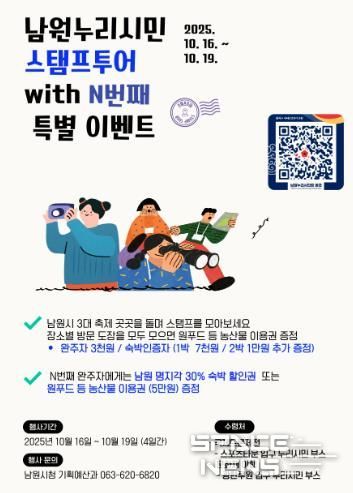 이와 함께 남원누리시민 15만명 돌파 기념 이벤트로 n번째 완주자 20명에게 12월 31일까지 사용할 수 있는 ‘명지각 숙소 30% 모바일 할인쿠폰’ 및 농산품 이용권을 추가 증정하여 재방문을 유도하고 스탬프투어 참여 열기를 높일 계획이다.