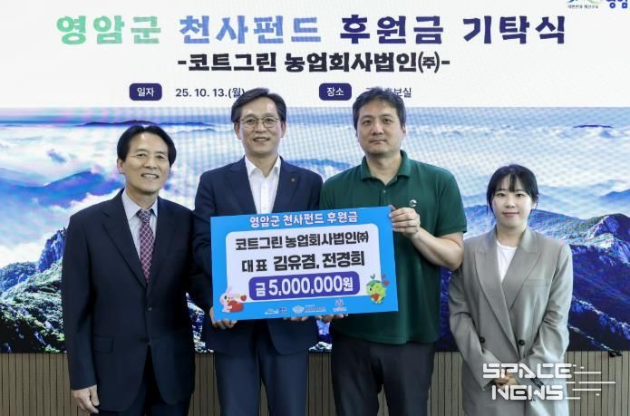 스페이스뉴스 스페이스뉴스 기자 | 코트그린농업회사법인(주)가 13일 영암군청에 천사펀드 500만원, 고향사랑기부금 200만원을 각각 전달했다.