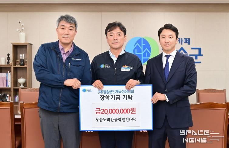 스페이스뉴스 스페이스뉴스 기자 | 청송노래산풍력발전(주)은 지난 16일 지역사회와의 상생 및 미래 인재 육성을 위해 (재)청송군인재육성장학회에 장학금 2천만 원을 기탁했다.