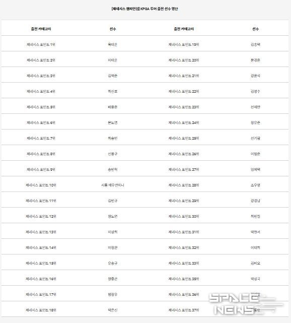 제네시스 포인트 1위 옥태훈(27.금강주택)을 비롯해 2위 이태훈(35.캐나다), 3위 김백준(24.속초아이), 4위 최진호(41.COWELL), 5위 배용준(25.CJ), 6위 문도엽(34.DB손해보험), 7위 최승빈(24.CJ), 8위 신용구(34.금강주택), 9위 송민혁(21.CJ), 10위 사돔 깨우깐자나(27.태국)까지 제네시스 포인트 TOP10 선수들과 36위 정한밀(34.경희), 37위 김동민(27.NH농협은행)까지 제네시스 포인트 상위 36명이 참가자 명단에 이름을 올렸다.