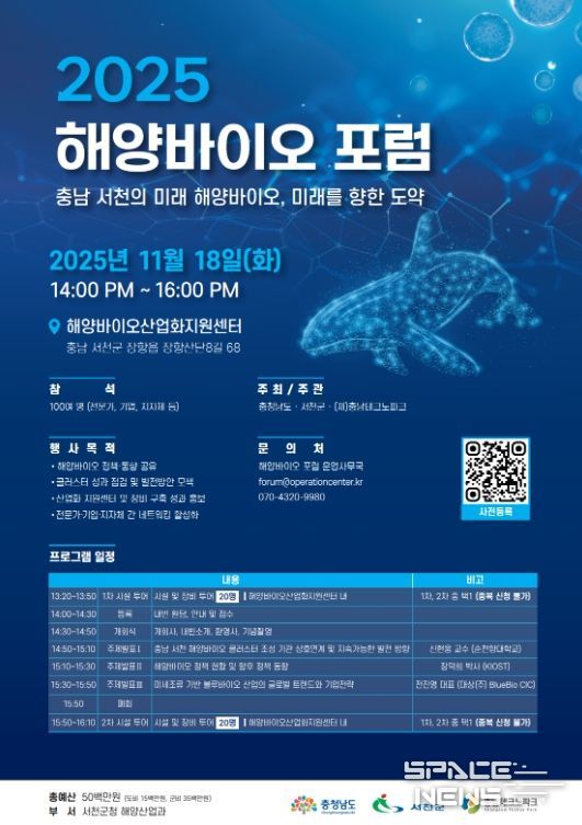 스페이스뉴스 스페이스뉴스 기자 | 서천군은 오는 11월 18일 서천 해양바이오 산업화 지원센터에서 ‘2025 해양바이오 포럼’을 개최한다.