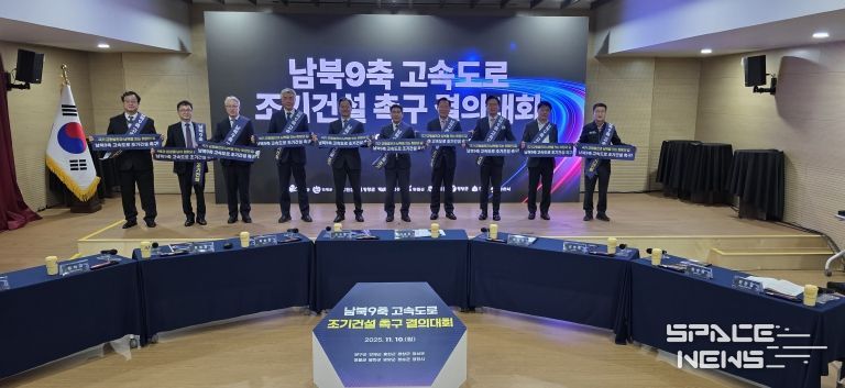스페이스뉴스 스페이스뉴스 기자 | 남북9축고속도로 추진협의회(협의회장:양구군수)는 10일 양구군 평생학습관에서 ‘남북9축고속도로 조기건설 촉구 결의대회’를 개최했다. 이번 행사에는 남북9축고속도로 추진협의회 10개 시·군의 단체장과 부단체장·기획부서장이 참석해 공동결의문을 만장일치로 채택·서명했으며, 제3차 고속도로 건설계획(2026~2030)에 남북9축(양구~영천) 고속도로를 반영할 것을 정부에 공식 요구했다.