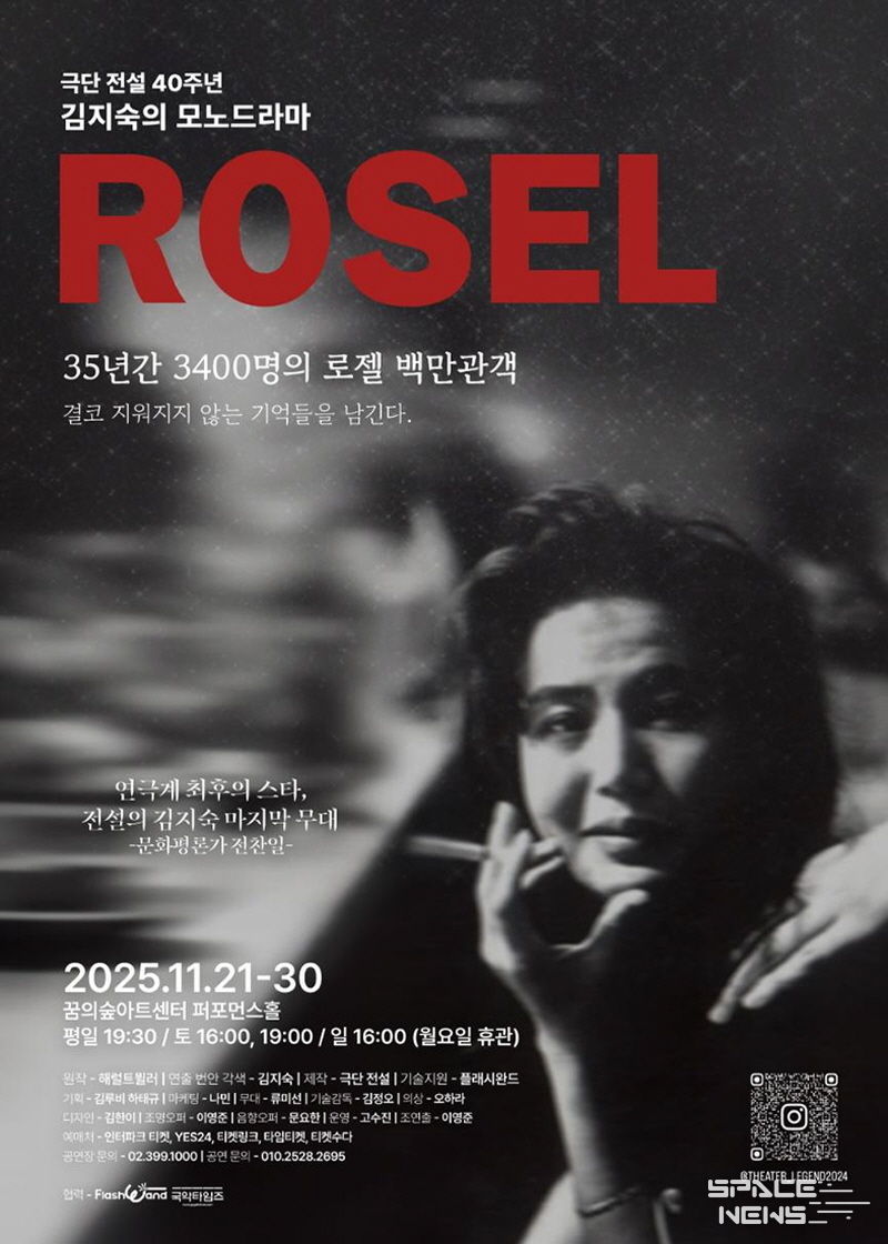 스페이스뉴스 스페이스뉴스 기자 | 극단 전설 40주년 기념작이자 배우 김지숙의 마지막 공연인 모노드라마 〈로젤〉이 오는 11월 21일부터 30일까지 꿈의숲아트센터 퍼포먼스홀에서 막을 올린다. 35년간 3,400회 이상 공연되며 백만 명이 넘는 관객을 울린 이 작품은 여성의 주체성과 인간성의 회복을 그린 한국 연극사의 대표작으로 꼽힌다.