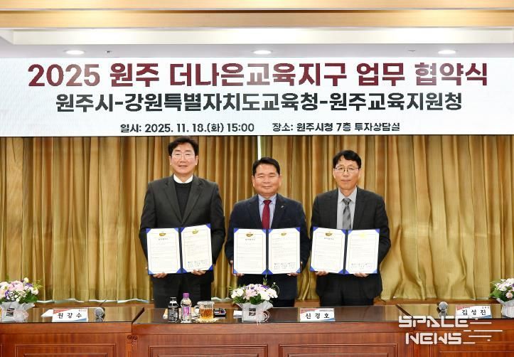 스페이스뉴스 스페이스뉴스 기자 | 원주시는 지난 18일 시청 7층 투자상담실에서 ‘원주 더나은교육지구’ 지정 연장 업무협약을 체결했다. 협약식에는 원강수 원주시장, 신경호 강원특별자치도 교육감, 김성진 원주교육지원청 교육장이 참석했다.