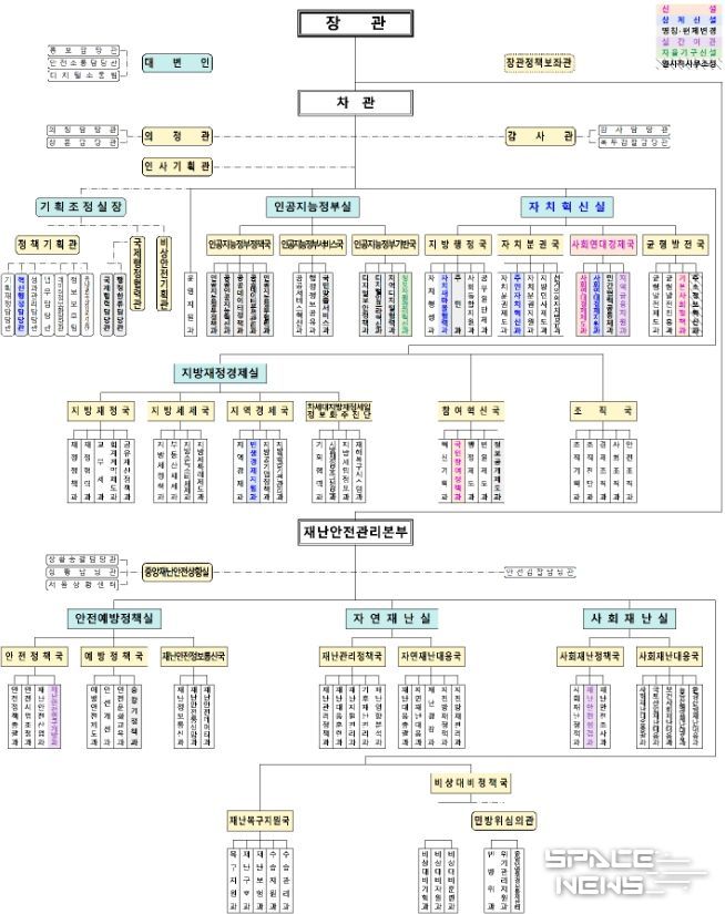 스페이스뉴스 스페이스뉴스 기자 | 행정안전부는 인공지능(AI), 지방정부 및 국민안전 정책 수준을 한단계 더 높이고, 국정과제 추진동력을 강화하기 위한 조직개편을 실시했다고 밝혔다.