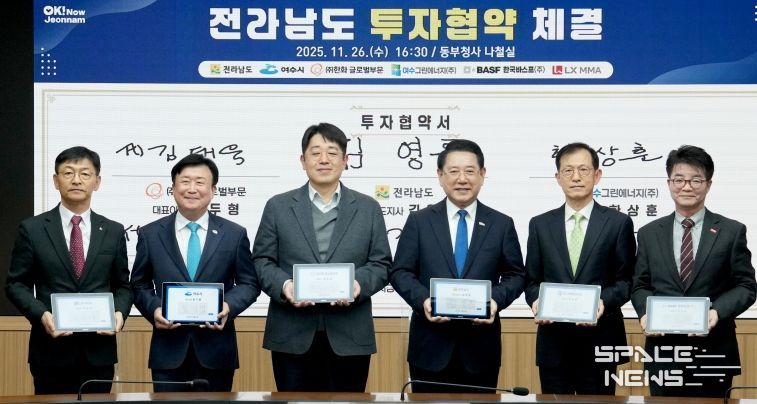 스페이스뉴스 스페이스뉴스 기자 | 전라남도는 26일 동부청사에서 여수그린에너지㈜, ㈜한화 글로벌부문, ㈜LX MMA 등과 1조 2천441억 원, 고용 창출 147명 규모의 투자협약을 했다.