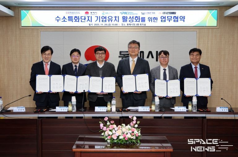 스페이스뉴스 스페이스뉴스 기자 | 동해시는 11월 28일 동해시청 본관 2층 회의실에서 강원특별자치도, 피케이밸브앤엔지니어링㈜, ㈜성원기업, ㈜진화메탈, ㈜GS동해전력과 함께 수소특화단지 기업유치 활성화를 위한 업무협약(MOU)을 체결했다고 밝혔다.