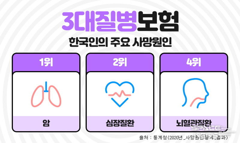 스페이스뉴스 스페이스뉴스 기자 | 한국인의 주요 사망원인중에 암, 뇌혈관질환, 심혈관질환은 흔히 3대질병이라 일컬어지며 살아가면서 가장 먼저 대비해야 하는 중대질병으로 항상 강조되고 있다. 이들 질병에 미리 대비하기 위해 가입하는 것이 진단비보험인데, 이러한 3대질병진단비를 중점으로 보장하는 보장성보험이 3대진단비보험 이다. 3대질병진단비보험은 각각의 질병에 주목해서 보장하기도 하지만, 나에게 맞는 추가 특약을 잘 골라서 가입한다면 종합건강보험으로도 충분히 활용도가 높다.