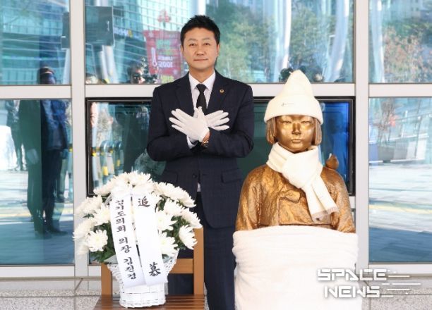 스페이스뉴스 스페이스뉴스 기자 | 김진경 경기도의회 의장(더민주, 시흥3)은 12일 오전 도의회 1층 입구에서 열린 ‘평화의 소녀상’ 7주년 추모식에 참석해 피해자들의 희생을 기렸다.