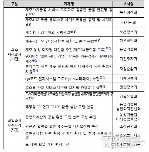 이 가운데 상위 5개 과제가 이날 발표 심사를 거쳐 최종 순위를 가렸으며, ‘제주4·3기록물 유네스코 세계기록유산 등재 및 세계화’와 ‘제주가치돌봄 서비스 고도화로 촘촘한 돌봄 안전망 강화’ 과제가 금상을 차지했다.